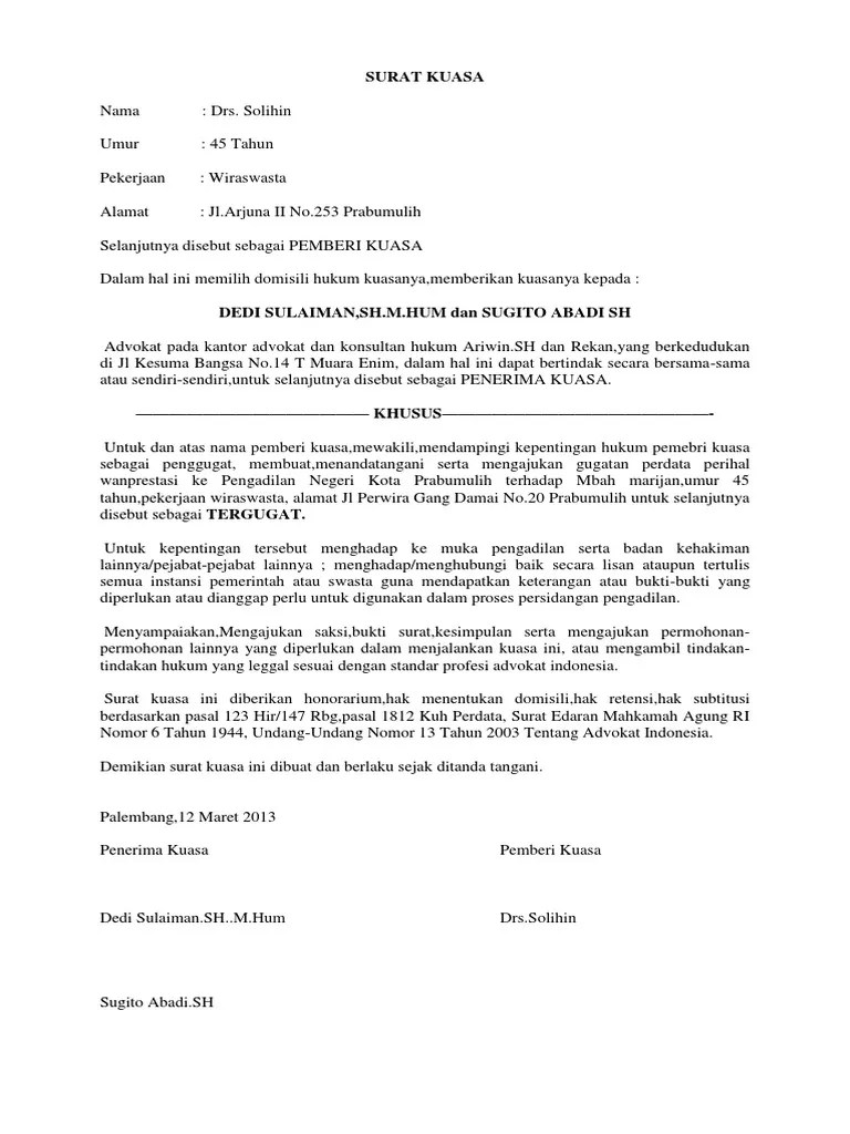 Apa saja yang bisa dilimpahkan dalam sebuah surat . Bagaimana cara membuat surat kuasa khusus yang benar . Dengan ini memberi kuasa penuh dengan hak substitusi kepada:. Untuk dan atas nama pemberi kuasa mewakili dalam sengketa tata usaha . Contoh surat kuasa khusus perdata. Contoh surat kuasa hukum atau surat kuasa khusus dalam perkara perdata tidak. Dengan ini memberikan kuasa kepada : Untuk dan atas nama pemberi kuasa mengajukan dan menangani gugatan perdata tentang perbuatan melawan hukum selaku penggugat di pengadilan negeri bondowoso;.